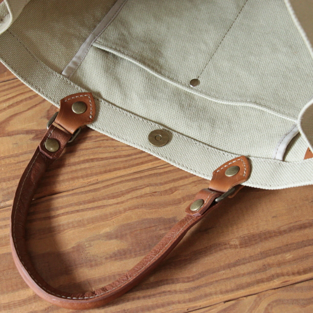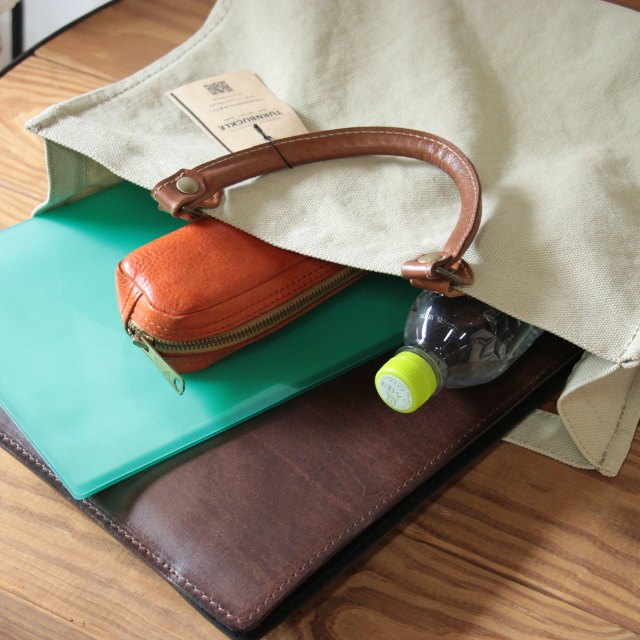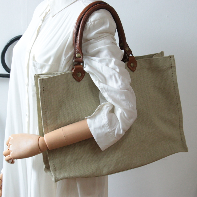 オリジナル倉敷帆布と革で作ったトートバッグになります。 帆布はターンバックオリジナルの厚手の帆布をウォッシュ加工をし、やわらかく仕上げました。 13インチのノートパソコンをレザーケースに入れて丁度入ります。 A4ファイルも余裕で入る大きさです。 底には、底鋲をつけてハンドル部分はレザーで仕立てました。 綺麗目カジュアルな見た目でお出かけや旅行などにも活躍してくれます。 |